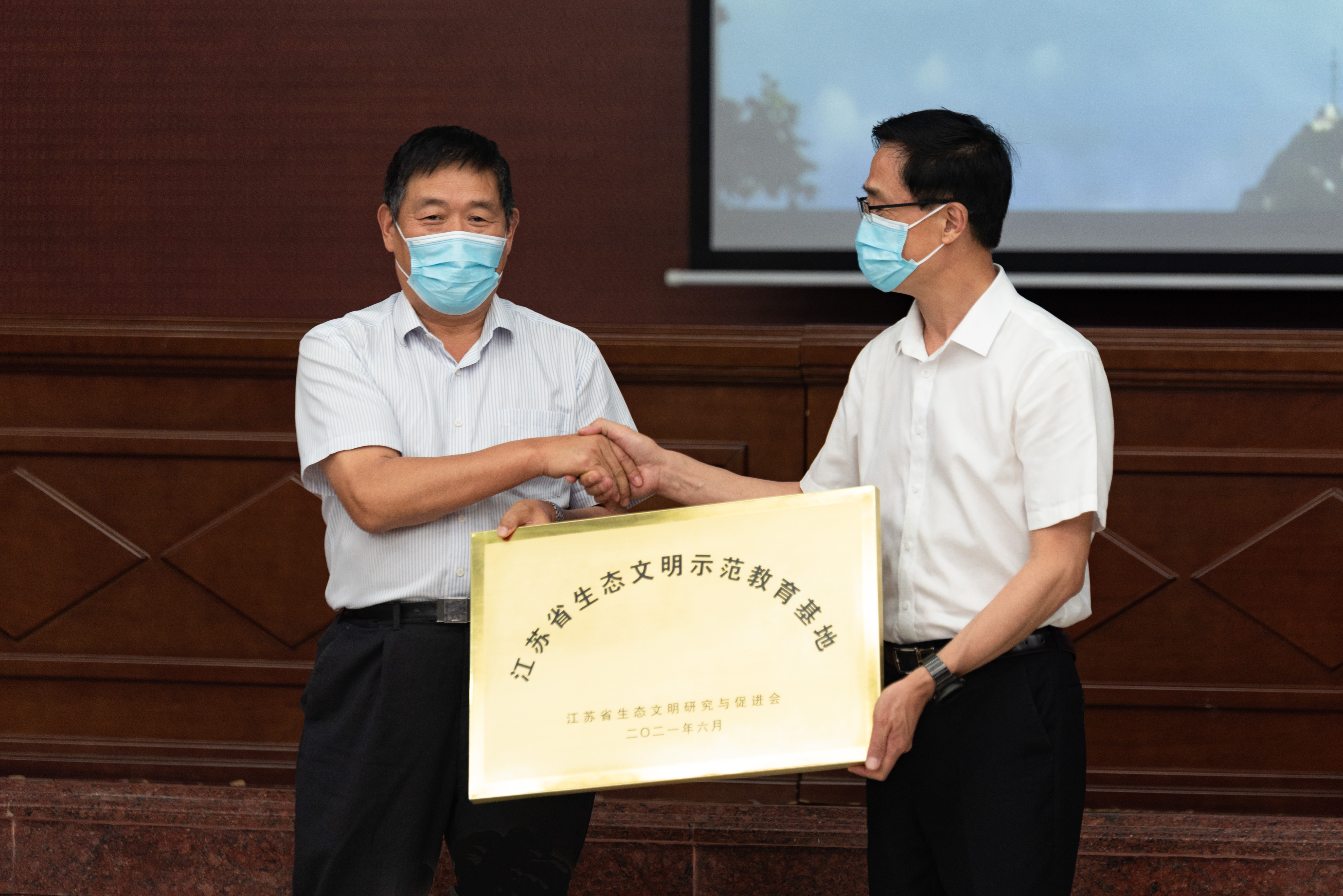 授牌仪式上,胡和林向胡锋授予“江苏省生态文明建设示范教育基地”挂牌。