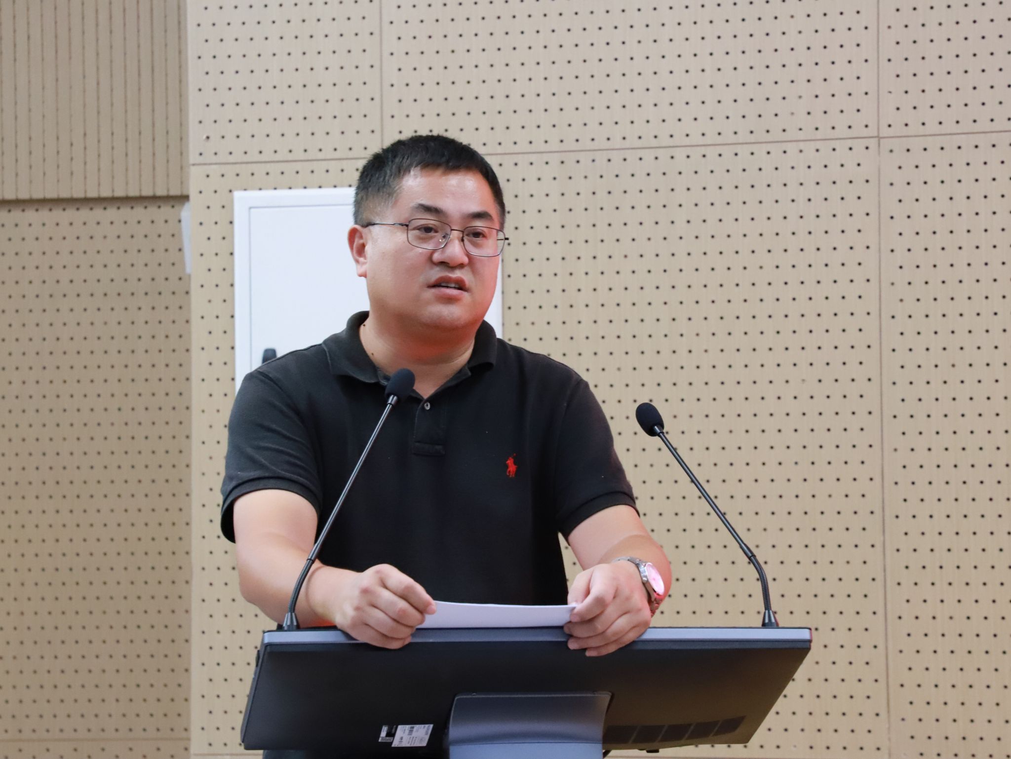 院党委书记李荣教授对新校区教师公寓建设情况作介绍,对学校发布的师德师风“十个是否”进行逐字逐句解读,号召全院进一步加强党纪学习教育,提醒91tv