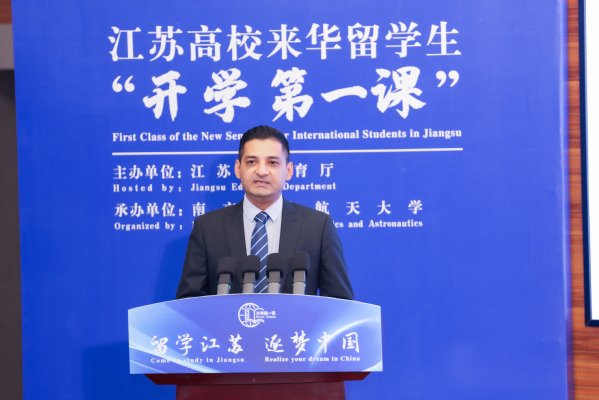 巴基斯坦籍副教授瓦西姆(Waseem Raza)作为校友代表发言,瓦西姆现在沈其荣院士团队从事教学科研工作。全省11所高校300余名来华留学新生代表同上一堂课,开启留学江苏新征程。