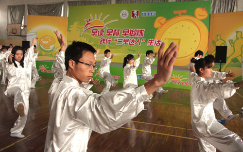 太极队的精彩表演赢得了在场同学们的阵阵掌声。游戏环节中,膳食宝塔让学生对人体所需营养结构有了深层次的了解;对对碰游戏让学生在运动的同时体验到团队合作力的重要。最后,由参加闭幕式的领导为本次三早活动的“微博达人”、“三早达人”颁发证书及奖项。