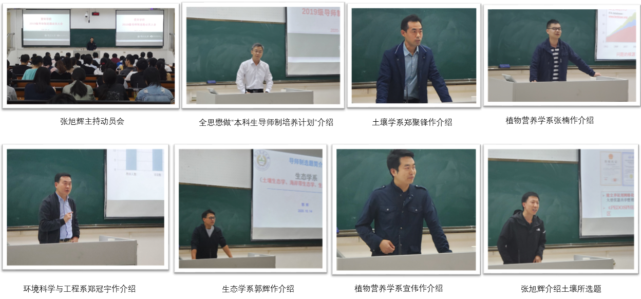 在教学楼C201举行2019级“本科生导师制培养计划”动员大会。此次会议由副院长张旭辉主持,党委书记全思懋、植物营养与肥料学系代表张楠、土壤系系主任郑聚锋、生态学系主任郭辉、环境科学与工程系系主任郑冠宇、教务秘书王洪梅及学院2019级全体本科生出席参加。