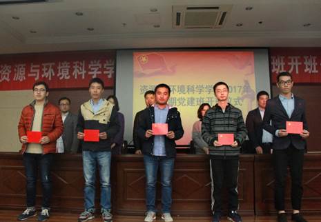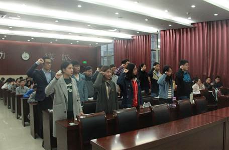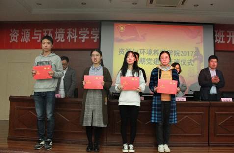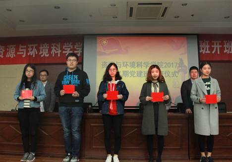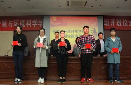 接下来党委副书记崔春红宣读了2017上半年党员转正名单和党员发展名单。随后颁发新党员通知书,周璐瑶作为老党员代表与新发展党员共同宣誓。宣誓完毕后,新发展党员代表陈思桥进行发言,他提出作为一名资环人,要紧跟国家与社会发展需求,我们要点燃强烈的探索求知欲望与创新意识,成为理论基础与专业技能扎实的创新型卓越人才,在完善自我的同时,也要敢于吃苦,勇于争先,充分发挥预备党员的先锋作用。