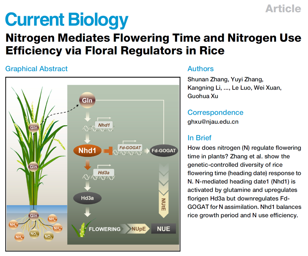 徐国华课题组在Current Biology 发表了题为Nitrogen mediates flowering time and nitrogen use efficiency via floral regulators in rice的长篇研究论文(Article)。