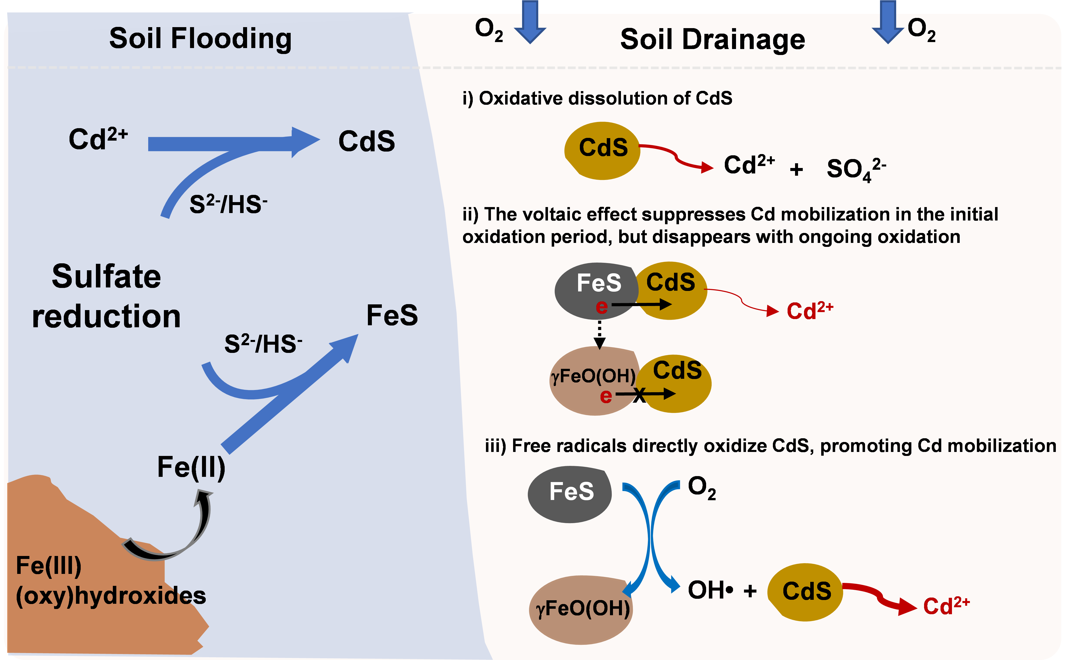 汪鹏教授课题组前期揭示了金属硫化物之间形成的原电池(voltaic cell)是控制稻田土壤排水过程中镉释放的重要作用机制(Huang et al., Environ. Sci. & Technol. 2021, 55, 1750-1758)。在土壤淹水阶段,无定形铁氧化物会发生还原溶解,释放大量游离的亚铁离子,能与硫酸盐还原产生的S2-/HS-结合生成硫化亚铁(FeS)。在土壤氧化阶段,FeS与硫化镉能形成原电池,影响硫化镉的氧化溶解,同时,FeS氧化能产生羟基自由基(•OH),这一过程是否会影响硫化镉的氧化溶解,目前也不是很清楚。