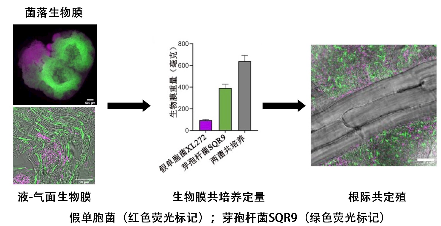 土壤微生物与有机肥团队张瑞福课题组的最新研究成果,“Bacillus velezensis stimulates resident rhizosphere Pseudomonas stutzeri for plant health through metabolic interactions”。该研究发现施用典型根际益生芽孢杆菌SQR9不仅可以独自促进植物生长,其代谢产物还能诱导土著“帮手”微生物—施式假单胞菌(Pseudomonas stutzeri)的显著富集,并与菌株SQR9共同在植物根际形成稳定的混菌生物膜。合成菌群的代谢建模、代谢组学分析以及功能基因敲除实验证明菌株SQR9能与土著施式假单胞菌代谢互养(Cross-feeding),拓宽了双菌菌群在植物根际的生态位宽度,并且这种代谢依赖驱动两株植物益生菌的长期共存,协同增强植物益生能力。