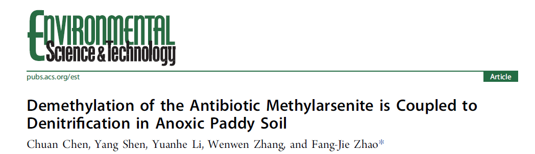 该研究结果以“Demethylation of the antibiotic methylarsenite is coupled to denitrification in anoxic paddy soil”为题目在Environmental Science & Technology在线发表。师资博士后陈川为论文第一作者,赵方杰教授为通讯作者。本项目研究得到了国家自然科学基金项目的资助。