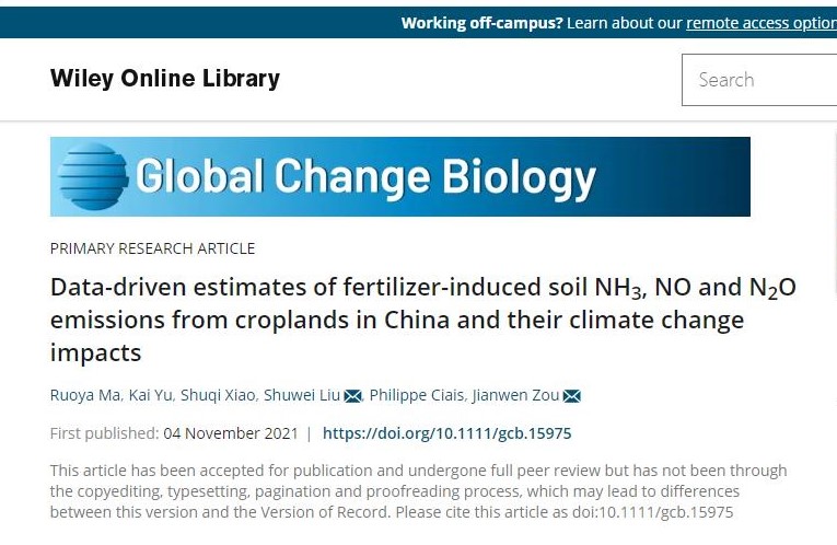相关研究成果近日以“Data-driven estimates of fertilizer-induced soil NH3, NO and N2O emissions from croplands in China and their climate change impacts”为题发表在国际全球变化研究领域权威学术期刊Global Change Biology上。该研究是继2017年在Global Change Biology上有关NO+N2O排放系数被IPCC《国家温室气体清单编制指南2019修订版》收录采用后,在氮肥施用活性氮排放系数方面取得的新进展,为进一步修正和更新IPCC指南中有关氮肥施用所引起的NH3,NO和N2O排放系数的全球缺省值提供了重要参考,同时也为寻求农业活性氮减排对策和了解全球和区域尺度上化肥施用的农业活性氮排放的时空分布提供了新的视角。