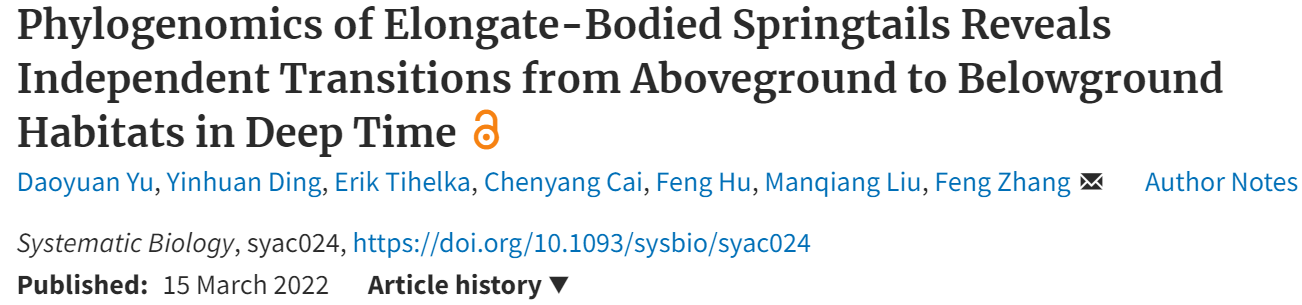 近日,国际演化生物学顶级期刊Systematic Biology在线刊登了题为“Phylogenomics of Elongate-Bodied Springtails Reveals Independent Transitions from Aboveground to Belowground Habitats in Deep-Time”的研究论文。该研究由91tv