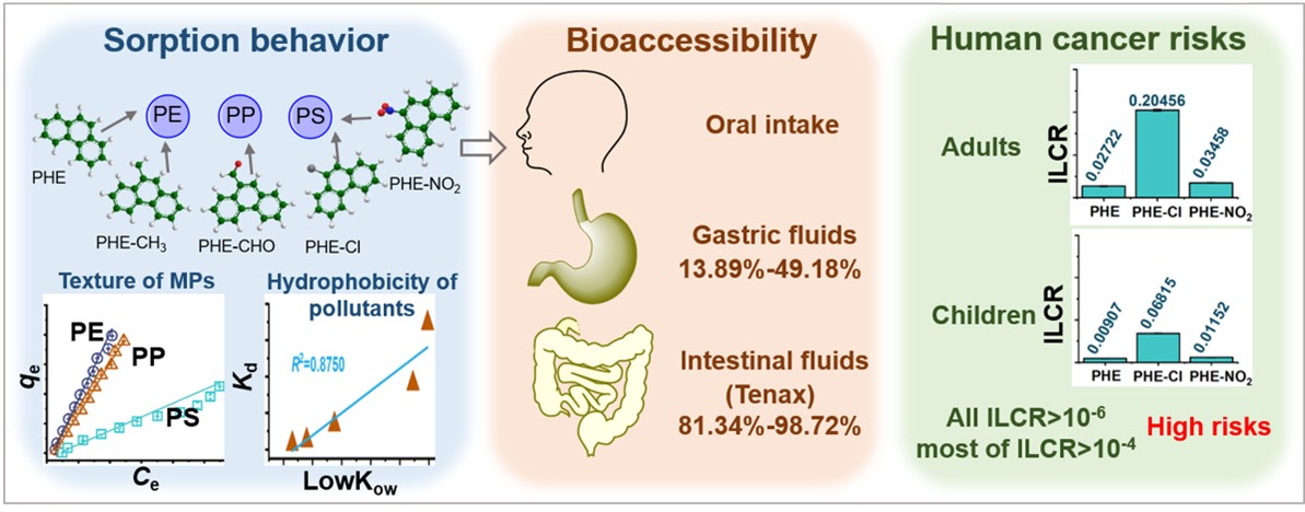 近日,胡小婕等以菲及其衍生物作为代表性芳烃类化合物,在揭示微塑料与此类化合物结合作用的基础上,通过模拟胃肠液释放作用,发现结合于微塑料的这些芳烃类化合物在人体内具有极高的生物可及性(最高达98%),且与微塑料材质及芳烃类化合物疏水性有关。通过终生癌症风险评估发现,人类经口摄食富集芳烃类化合物的微塑料存在潜在致癌风险。