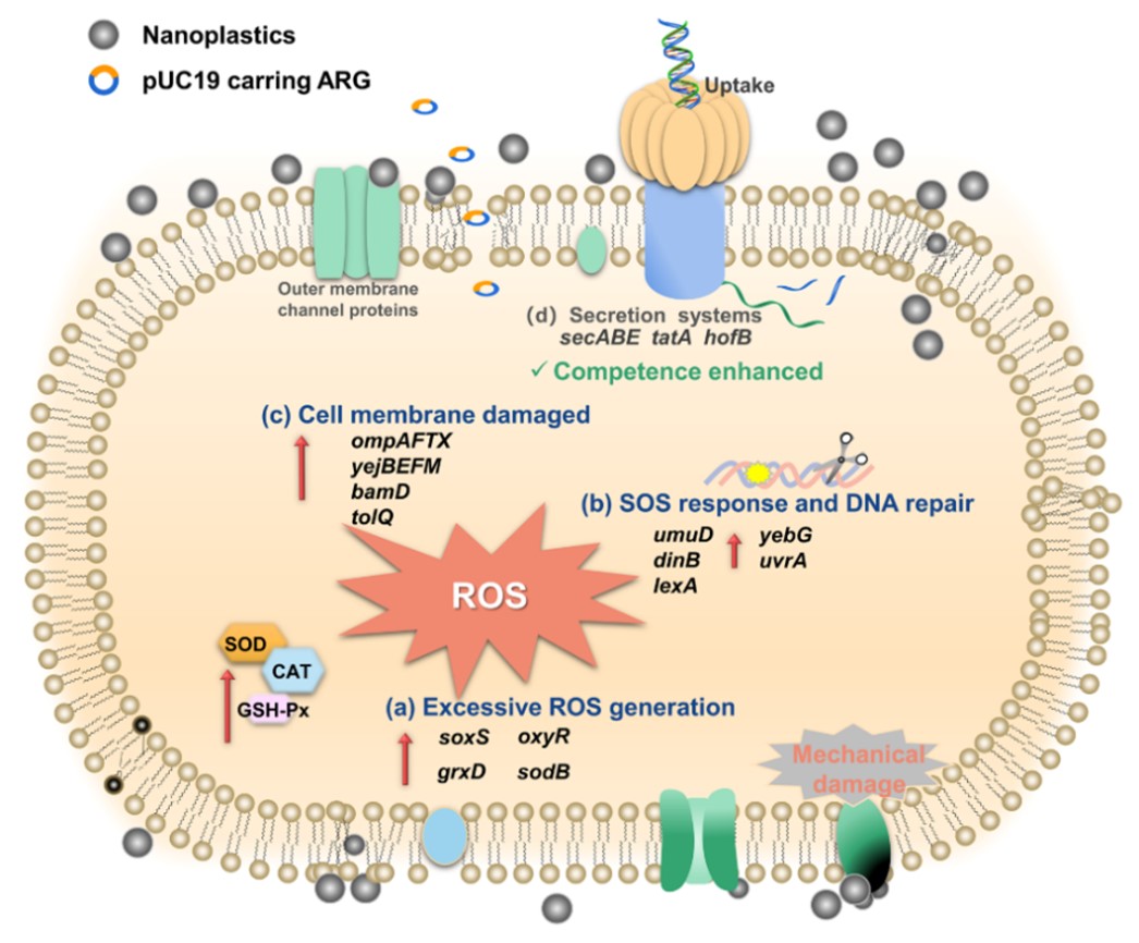 微(纳米)塑料在环境中普遍存在,持久性微塑料可通过其直接毒理学效应或间接改变各种污染物的迁移和滞留对海洋生物和生态系统造成生态毒性,严重威胁人类健康。抗生素抗性基因(ARGs)作为新型环境污染物,在环境中的传播可使人类致病菌获得抗性而导致抗生素难以治疗,是本世纪人类面临的重大挑战。最近,微(纳米)塑料对抗生素耐药性传播的影响引起了广泛关注。微塑料可以作为抗生素耐药性传播的载体,对ARGs水平基因转移具有潜在风险。然而,微(纳米)塑料如何影响抗生素耐药性在水环境、土壤或人类肠道系统中的传播,目前仍不清楚。