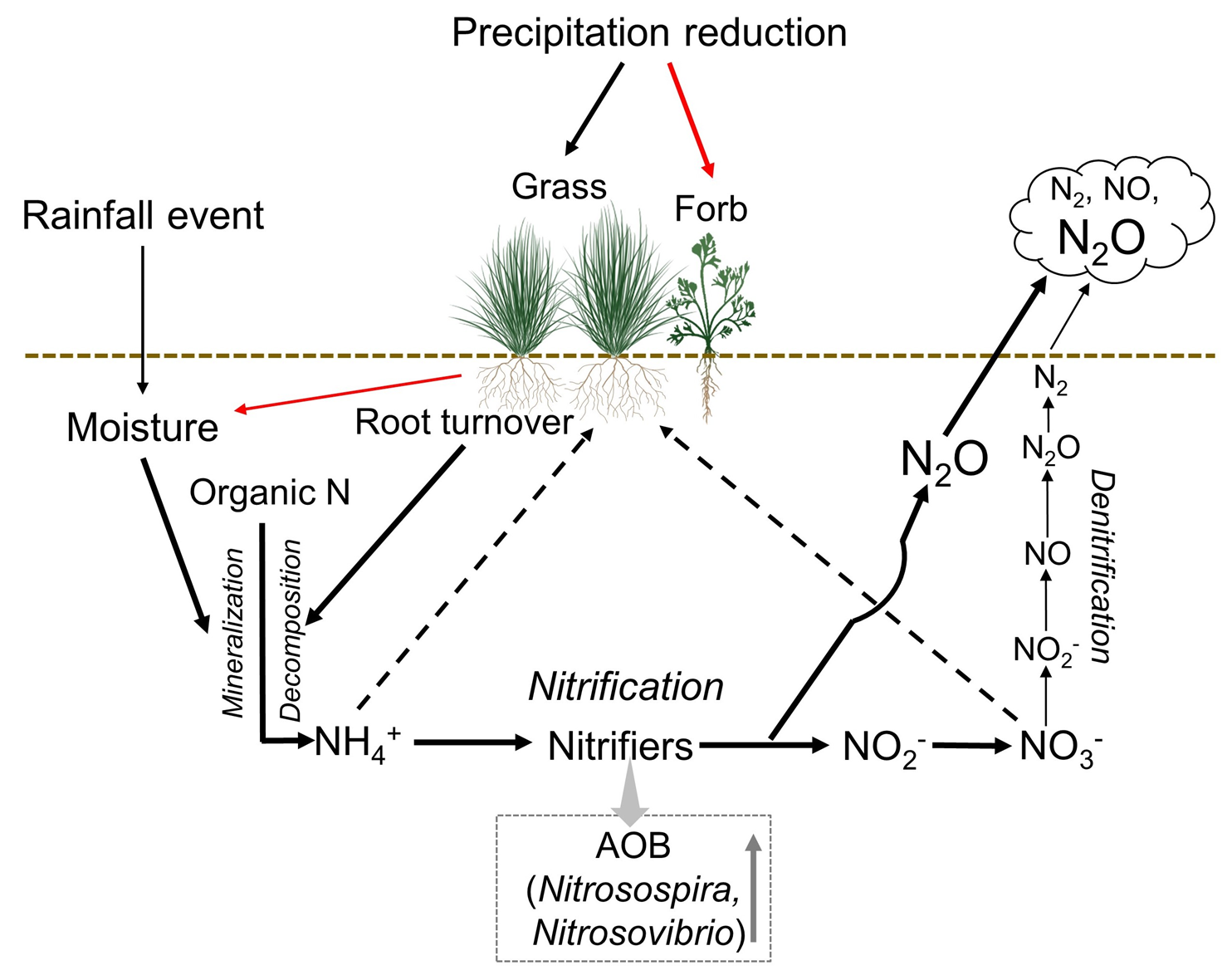 氧化亚氮(N2O)是一种强效温室气体,其全球增温潜势是二氧化碳(CO2)的300倍左右,对平流层臭氧具有强破坏性。在自然生态系统中,半干旱草地是非常重要的N2O排放源。气候变化,改变降水格局, 导致半干旱地区更加频繁的干湿交替,显著影响陆地生态系统土壤氮循环过程,进而调控土壤N2O排放。然而,降水减少和土壤干湿交替如何影响半干旱草地氮循环微生物和N2O 排放尚不清楚。