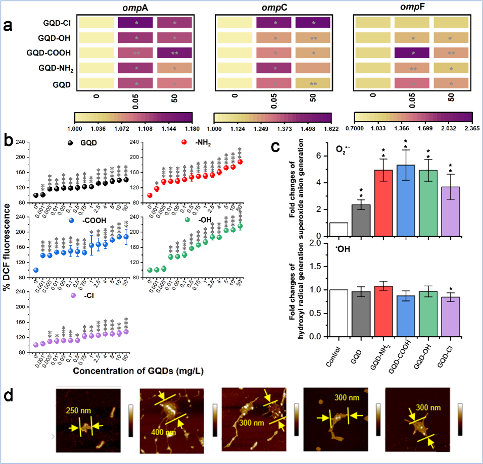 图2(a)GQDs对宿主膜蛋白相关基因表达的影响;(b)和(c)GQDs对宿主胞内活性氧自由基产生的影响;(d)GQDs与抗性质粒交缠形成大的结合体