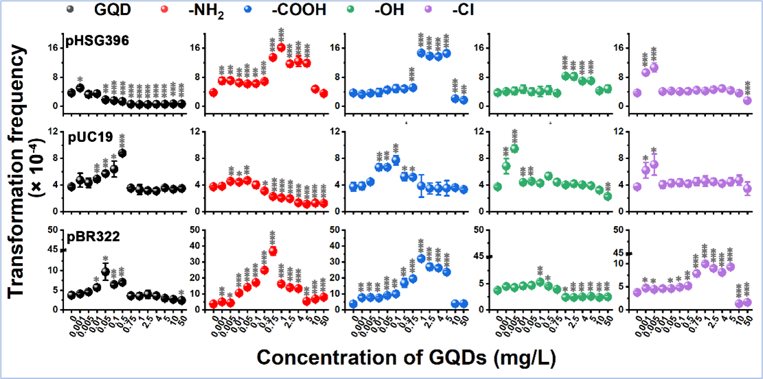 该研究成果以“Graphene quantum dots nonmonotonically influence the horizontal transfer of extracellular antibiotic resistance genes via bacterial transformation”为题发表于期刊Small上,助理研究员胡小婕为第一作者,高彦征教授为通讯作者。