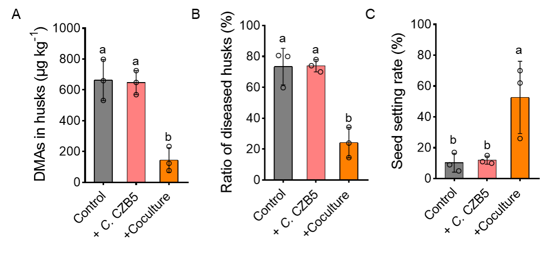 图2. 添加Methanomassiliicoccus luminyensis CZDD1与Clostridium malenominatum CZB5共培养液缓解水稻直穗病。不同处理对水稻颖壳中DMAs含量(A),水稻“直穗病”发病率(B)及水稻结实率(C)的影响。