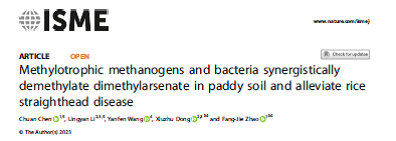 近日,赵方杰与东秀珠团队在The ISME Journal发表了“Methylotrophic methanogens and bacteria synergistically demethylate dimethylarsenate in paddy soil and alleviate rice straighthead disease”文章,发现甲基营养型产甲烷马赛球菌(Methanomassiliicoccus)与细菌共营将DMAs脱甲基,向土壤添加产甲烷马赛球菌与梭菌的共培养液可显著降低水稻对DMAs的积累,有效缓解水稻“直穗病”。