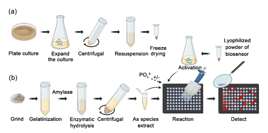 图3生物传感器冻干储存(a)和试剂盒测定稻米无机砷检测流程(b)