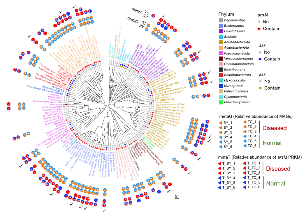 图4.通过宏基因组分箱获得的组装基因组(MAGs)中携带arsM基因的细菌及在稻田发病与正常区域中arsM转录水平的差异