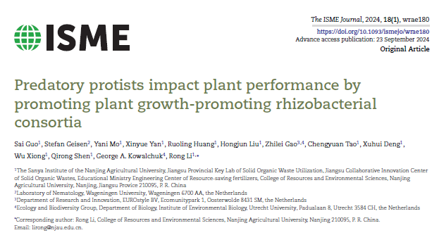沈其荣院士团队李荣课题组在微生物生态学国际权威期刊《The ISME Journal》上发表了题为“Predatory protists impact plant performance by promoting plant growth-promoting rhizobacterial consortia” 的研究论文,揭示了捕食型原生生物 Cercomonas lenta 通过增强根际有益微生物合作促进植物生长的微生物生态学机制。