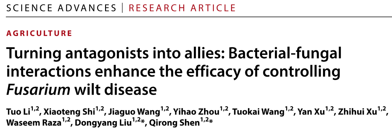资源与环境科学学院沈其荣院士课题组在《Science Advances》杂志上发表题为“Turning antagonists into allies: Bacterial-fungal interactions enhance the efficacy of controlling Fusarium wilt disease”的论文,该研究阐明了细菌与真菌从拮抗到共存的互作模式转变对防控番茄枯萎病的重要作用机制。