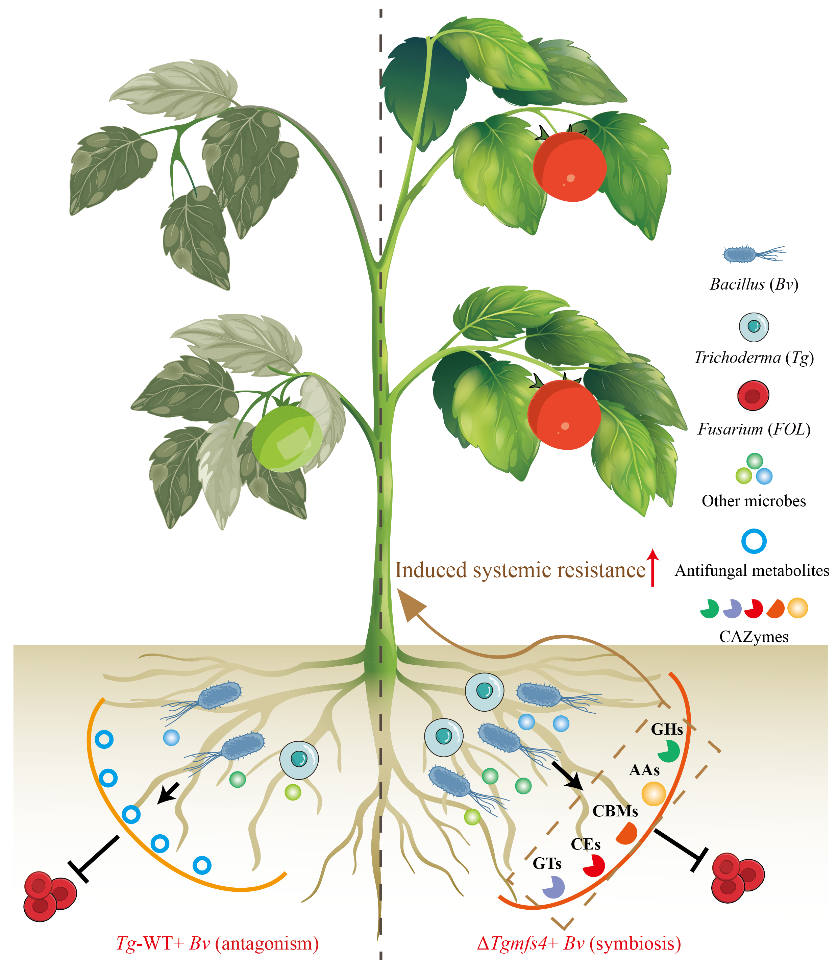 进一步的研究发现,与两株野生型菌株联合接种(Tg-wt+ Bv)相比,Tgmfs4基因缺失菌株ΔTgmfs4与Bv的联合接种(ΔTgmfs4+ Bv)后,番茄根际Bv与Tg定殖数量显著提高,病原菌丰度显著降低。此外,ΔTgmfs4+ Bv组合接种显著还改变了番茄根际微生物群落功能,特别是上调碳水化合物活性酶(CAZymes)家族基因的表达,这不仅增强了番茄的免疫反应,还建立了有效的生物屏障,抑制病原真菌的增殖。