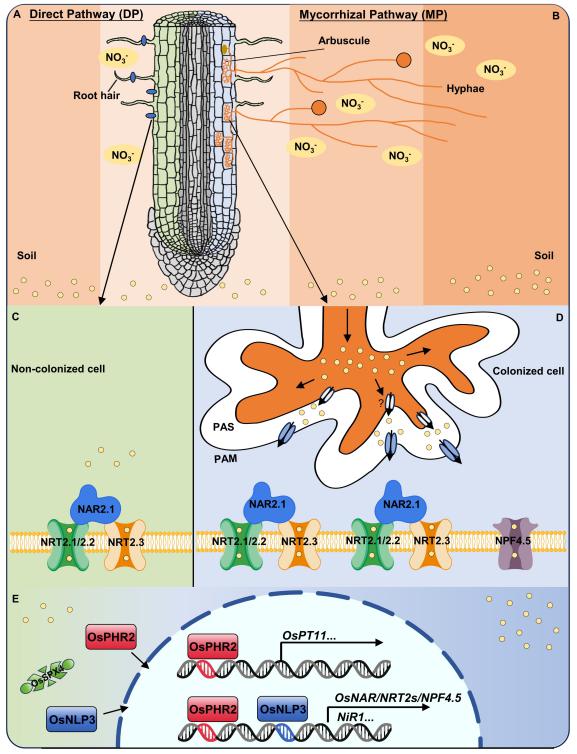 协同调控直接途径和菌根途径硝酸盐吸收的模式图