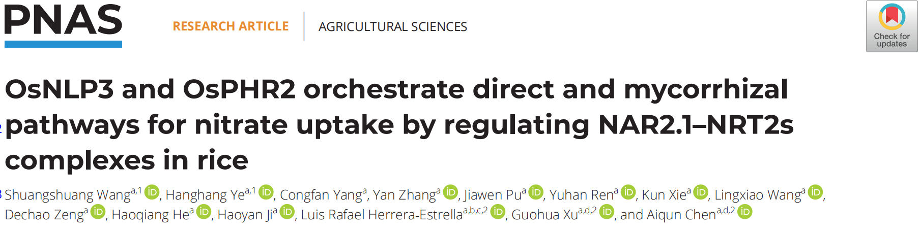 徐国华、陈爱群教授团队之前已经发现作物根系存在保守的氮素吸收菌根途径(Wang et al., 2020, PNAS)。近日,该团队在PNAS上再次发表了题为“OsNLP3 and OsPHR2 orchestrate direct and mycorrhizal pathways for nitrate uptake by regulating NAR2.1-NRT2s complexes in rice”的研究论文,首次系统阐明了两个转录因子OsNLP3和OsPHR2协同调控硝酸盐转运蛋白复合体NAR2.1-NRT2s介导的氮素吸收直接途径和菌根途径的分子机制。