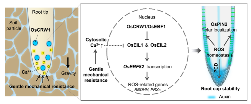 综上所述,本研究揭示了OsCRW1(OsEBF1)和根冠机械力感应通过抑制OsEIL1/OsEIL2-OsERF82-ROS信号模块对维持根冠结构稳定和根尖生长素分布起重要作用, OsCRW1和机械力-钙信号提供了限制乙烯激活信号放大的双重保险,确保水稻根系的向地性生长(图2)。