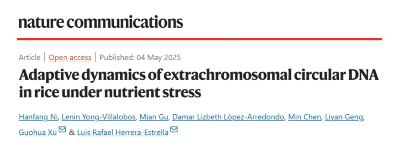 徐国华教授团队与美国德州理工大学研究人员合作,在《Nature Communications》发表了题为《Adaptive Dynamics of Extrachromosomal Circular DNA in Rice Under Nutrient Stress》的研究论文。该研究首次系统揭示了植物中染色体外环状DNA(eccDNA)响应养分胁迫的动态变化机制,阐明了在氮和磷缺乏条件下,含有基因和转座子重叠序列的eccDNA所指示的水稻基因组可塑性特征(图1),为作物养分高效利用的遗传改良提供了新的理论依据和研究思路。