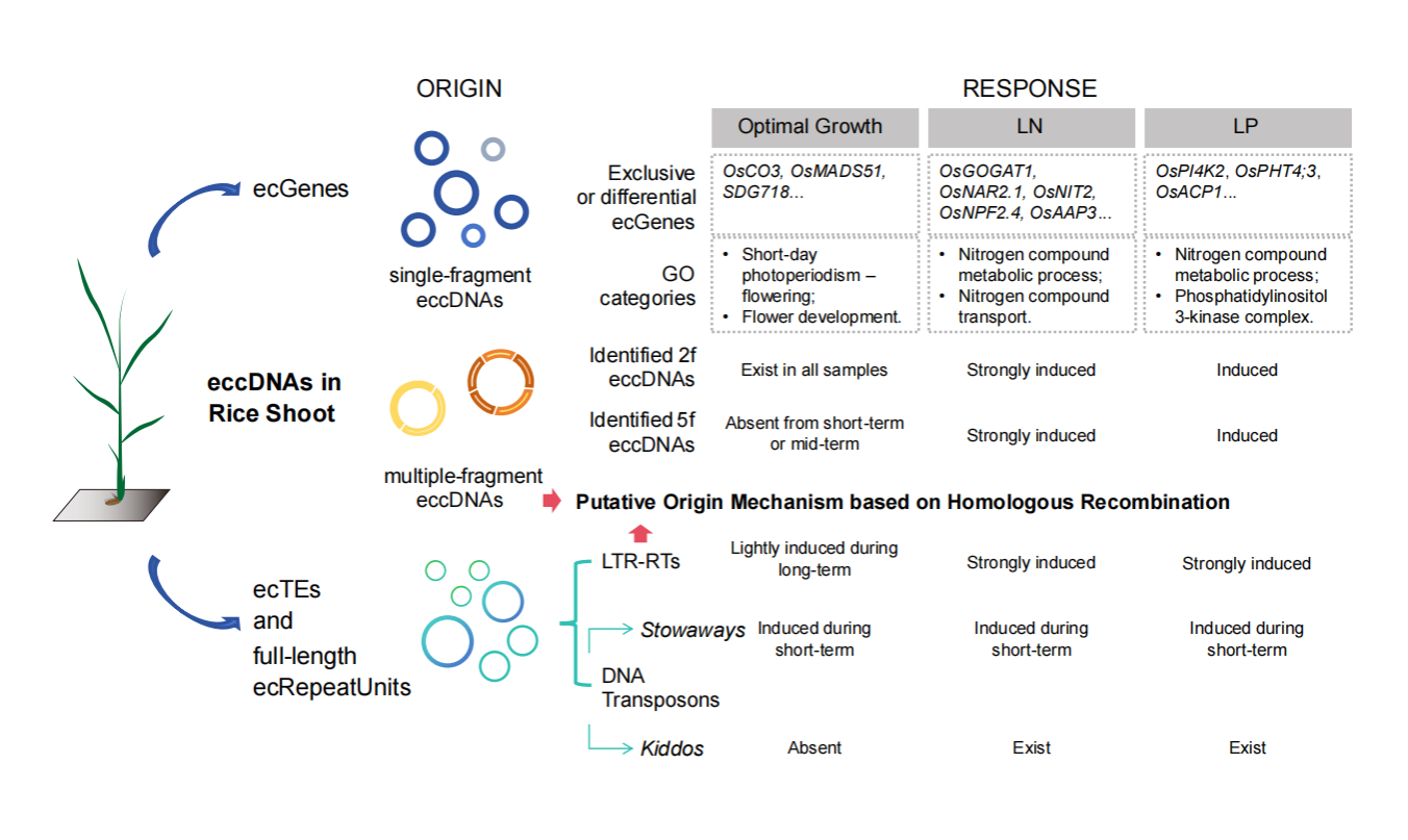图1. 水稻基因组可塑性的环境适应机制:基因及转座子相关eccDNA在氮磷胁迫中的动态调控