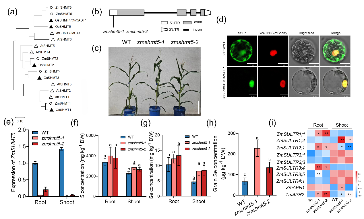 研究团队前期在拟南芥和水稻中分别中发现核定位丝氨酸羟甲基转移酶MSA1和OsCADT1的突变可上调硫缺乏响应基因表达和激活硫酸盐/硒酸盐吸收同化途径,促进硫/硒的积累(Huang et al., 2016; Chen et al., 2020)。在此基础上,本研究聚焦玉米核定位的同源蛋白ZmSHMT5,突变该基因激活了硫/硒吸收与同化相关基因(如ZmSULTRs和ZmAPR)的表达,促进了硫酸盐、谷胱甘肽等含硫代谢物以及多种硒形态的积累。大田试验证实,突变体玉米籽粒中硒含量最高提升至野生型的2.8倍,同时多种氨基酸和蛋白质含量也显著增加,显示出良好的营养强化效果。该研究不仅揭示了ZmSHMT5在玉米硫/硒积累中的作用,也为通过基因编辑或分子育种手段实现玉米硒生物强化提供了理论依据和基因资源。