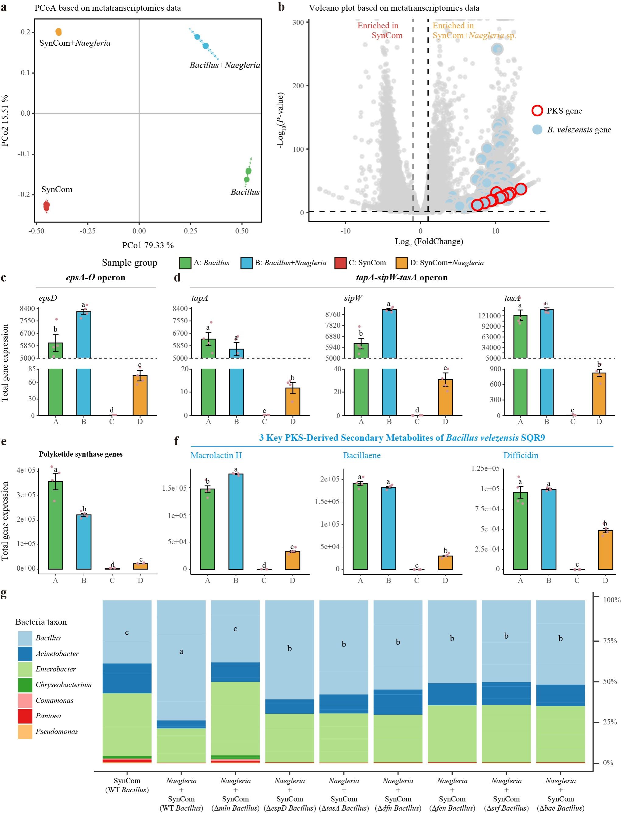 本研究选取了土壤中分离的两种不同类型原生动物,贴壁捕食型(Surface-feeding)阿米巴Naegleria和悬浮捕食型(Suspension-feeding)鞭毛虫Cercomonas。研究发现这两种类型原生动物都能直接高效捕食番茄青枯病原菌。基于实验室已构建的根际简化菌群(SynCom),在土壤微宇宙实验中发现植物有益菌贝莱斯芽孢杆菌(Bacillus velezensisSQR9)绝对数量和相对丰度在短时间内均显著下降,但添加阿米巴Naegleria能显著提升贝莱斯芽孢杆菌的数量和丰度,该结果表明原生动物能提升外源接种植物有益菌在土壤的存活率,从而增强其应用效果,在两季盆栽试验中也得到了证实。另外,通过阿米巴Naegleria与简化菌群共培养实验结合转录组测序分析,发现阿米巴Naegleria能诱导简化菌群中贝莱斯芽孢杆菌生物膜形成基因和次级代谢产物合成基因表达上调(图1)。为验证以上结论,通过构建Bacillus velezensisSQR9生物膜形成相关基因突变体(ΔepsD和ΔtasA)以及次级代谢产物合成相关基因突变体(Δfen, Δsrf, Δdfn, Δbae和Δmln),继续进行阿米巴Naegleria与简化菌群微宇宙实验并测定不同贝莱斯芽孢杆菌突变体和野生型在简化菌群中的数量。在阿米巴Naegleria存在条件下,缺失了macrolactin H合成能力的贝莱斯芽孢杆菌(Δmln)在简化菌群中的丰度下降最明显,该结果表明macrolactin H可能是贝莱斯芽孢杆菌逃避原生动物捕食并在根际菌群中保持竞争优势的关键代谢物(图1)。
