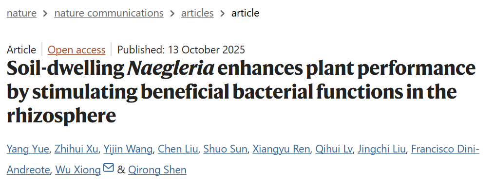 沈其荣院士团队熊武教授在Nature Communications期刊上发表了题为“Soil-dwelling Naegleria enhances plant performance by stimulating beneficial bacterial functions in the rhizosphere”的研究论文。该研究揭示了土壤原生动物通过调控根际菌群生物膜形成和次级代谢产物合成促进植物健康生长的微生态机制。