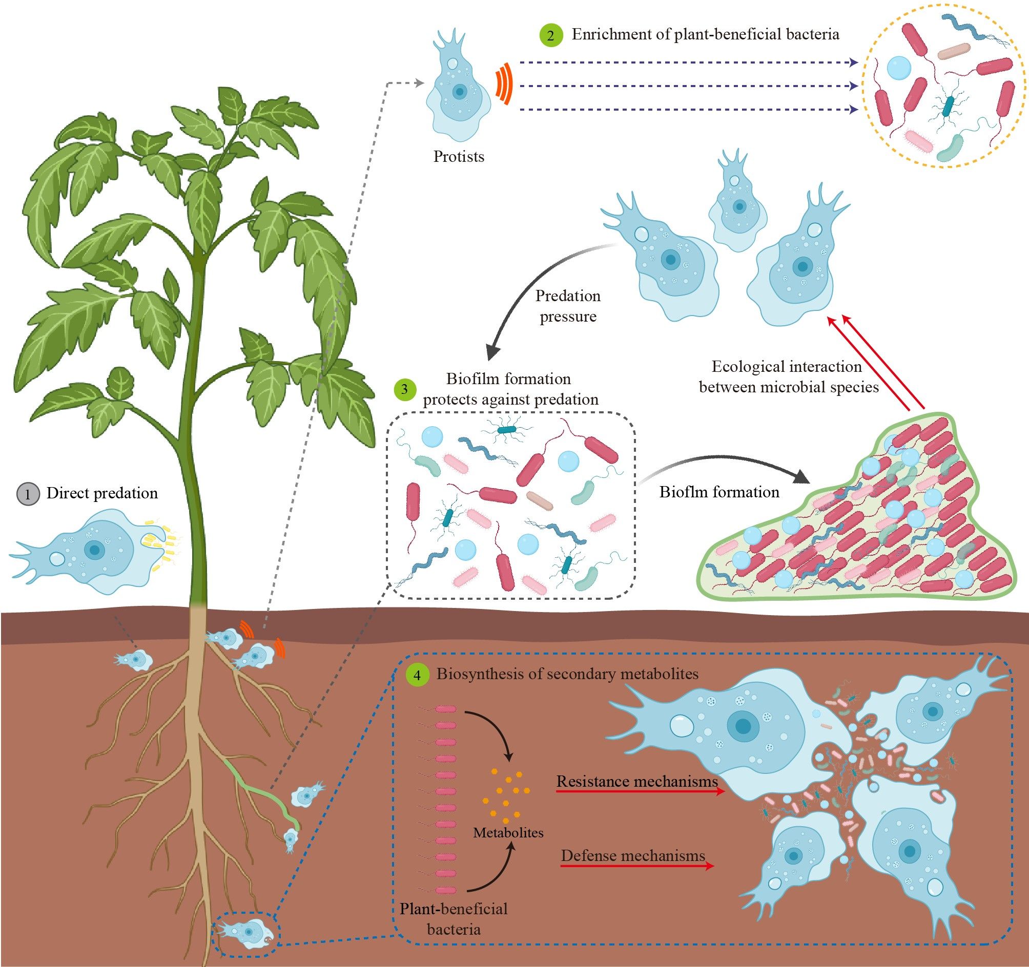 本研究系统性总结了土壤原生动物与根际菌群互作促进植物健康生长的微生态机制(图2),原生动物阿米巴Naegleria四个主要的根际生态功能总结如下:①原生动物直接捕食植物病原菌;②原生动物通过选择性捕食富集植物有益细菌;③原生动物促进根际菌群生物膜形成;④原生动物促进根际菌群次级代谢产物合成。