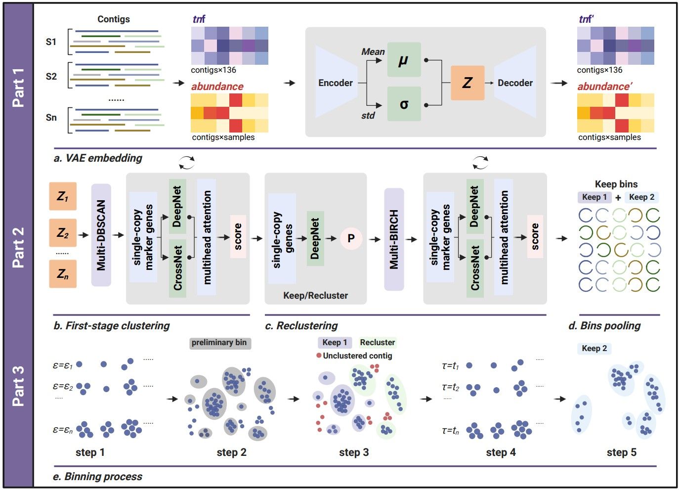 宏基因组分箱看似简单,但挑战很大。既要克服复杂微生物群落中物种组成与丰度的不确定性、未知物种参考基因组缺失的限制,还需有效区分高度相似近缘物种、甚至菌株水平的遗传变异规律,更要突破三代宏基因组测序的原始数据利用率、长序列编码、特征提取、异形分布数据聚类与簇质量评估算法等一系列技术难题。为此,LorMe实验室联合我校BioAI实验室协同攻关,创新了一种三代宏基因组长读分箱的无监督深度学习工具LorBin。该工具针对分箱全过程的卡点,从技术原理上提出四项针对性创新设计:1)适配变分自编码器训练学习复杂生境中DNA序列片段的特征分布,克服DNA大语言模型在处理长序列时面临的诸多挑战;2)构建两阶段多尺度自适应迭代聚类算法应对复杂物种空间分布,回收更多独特的未知微生物类群;3)在聚类过程中引入单拷贝基因集等信息引导的循环分箱质量评估模型,突破类内评估瓶颈,提升分箱质量和原始数据利用率;4)采用Transformer模型与统计概率模型,评估簇在高维空间的凹凸性对分箱效果的影响,解决高维生物数据嵌入特征在降维前后空间分布一致性评估的难题。