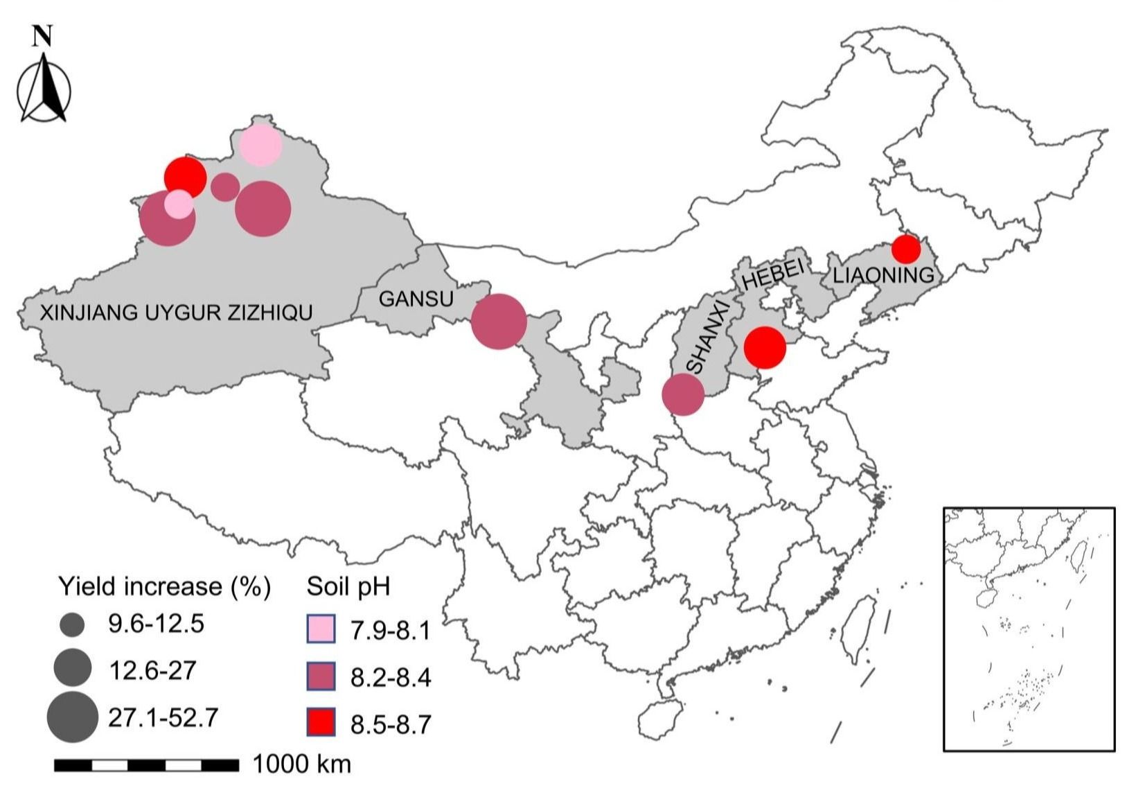 沈其荣院士团队张瑞福教授课题组在Cell Reports上发表了最新研究成果“Siderophore-mediated iron enrichment in the biofilm matrix enhances plant iron nutrition”。该研究以根际益生贝莱斯芽孢杆菌SQR9为研究对象,通过和南宁汉和生物科技股份有限公司开展合作,联合开发的“菌加富”产品在我国北方新疆、甘肃、山西、河北和辽宁五省展开大范围的大田实验,发现菌株SQR9能显著促进不同作物在碱性土壤中生长,平均增产10%以上(图1)。