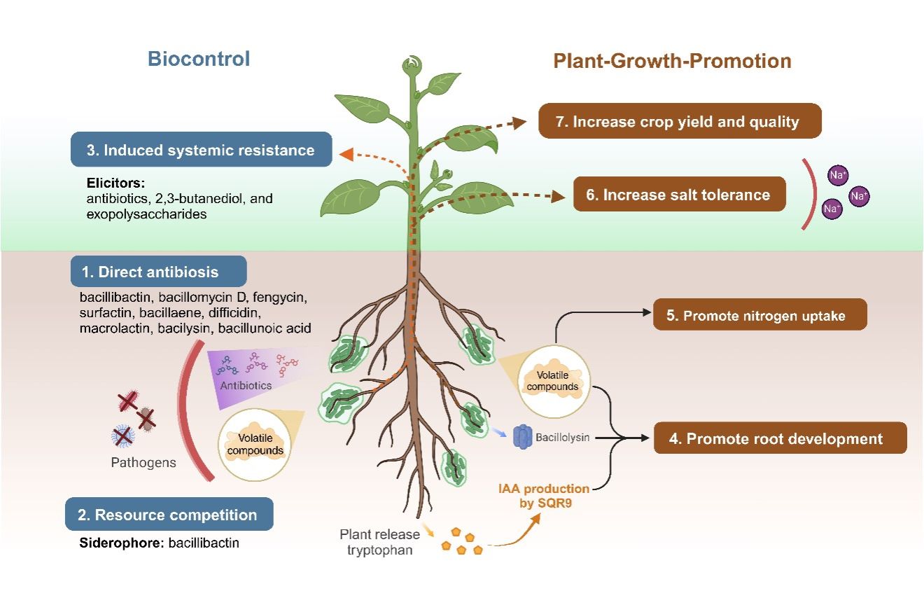化肥的广泛使用显著提升了农业产量,但也带来了土壤退化和环境压力。推动农业绿色发展,开发高效可持续的生物肥料已成为重要方向。其中,植物促生菌能够促进作物养分吸收、抵御病害并提升环境适应性。芽孢杆菌因其形成芽孢休眠体的特性和多样的促生防病机制,成为生物肥料研究与应用最广泛的细菌类群。贝莱斯芽孢杆菌SQR9(Bacillus velezensisSQR9)作为模式生防促生菌株,在分子机制、生态互作与田间应用方面积累了丰富研究,其系统总结为理解植物—微生物互作和推动生物肥料产业提供了重要参考。