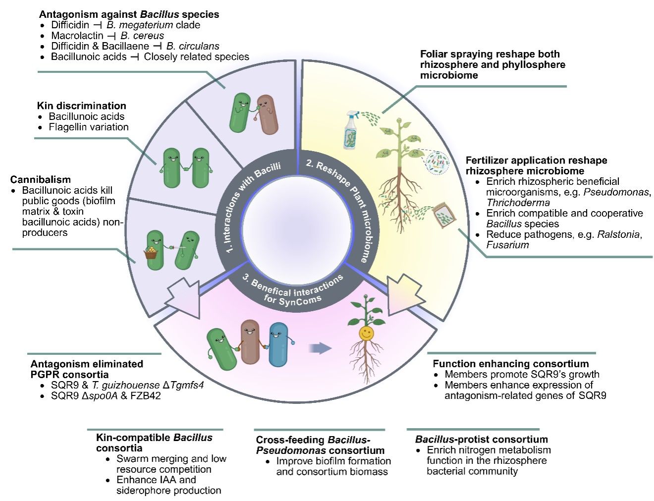 四、根际微生物互作网络。根际微生物互作直接影响定殖和功能发挥。菌株SQR9可调控微生物群落,提高兼容益生菌丰度、降低病原菌丰度,并施展竞争与合作策略:通过抗生素拮抗竞争者、通过铁载体争夺营养,同时与有益菌进行代谢互养和生物被膜协同。基于这些生态互作原理,可优化合成菌群设计,增强生防和促生功能。