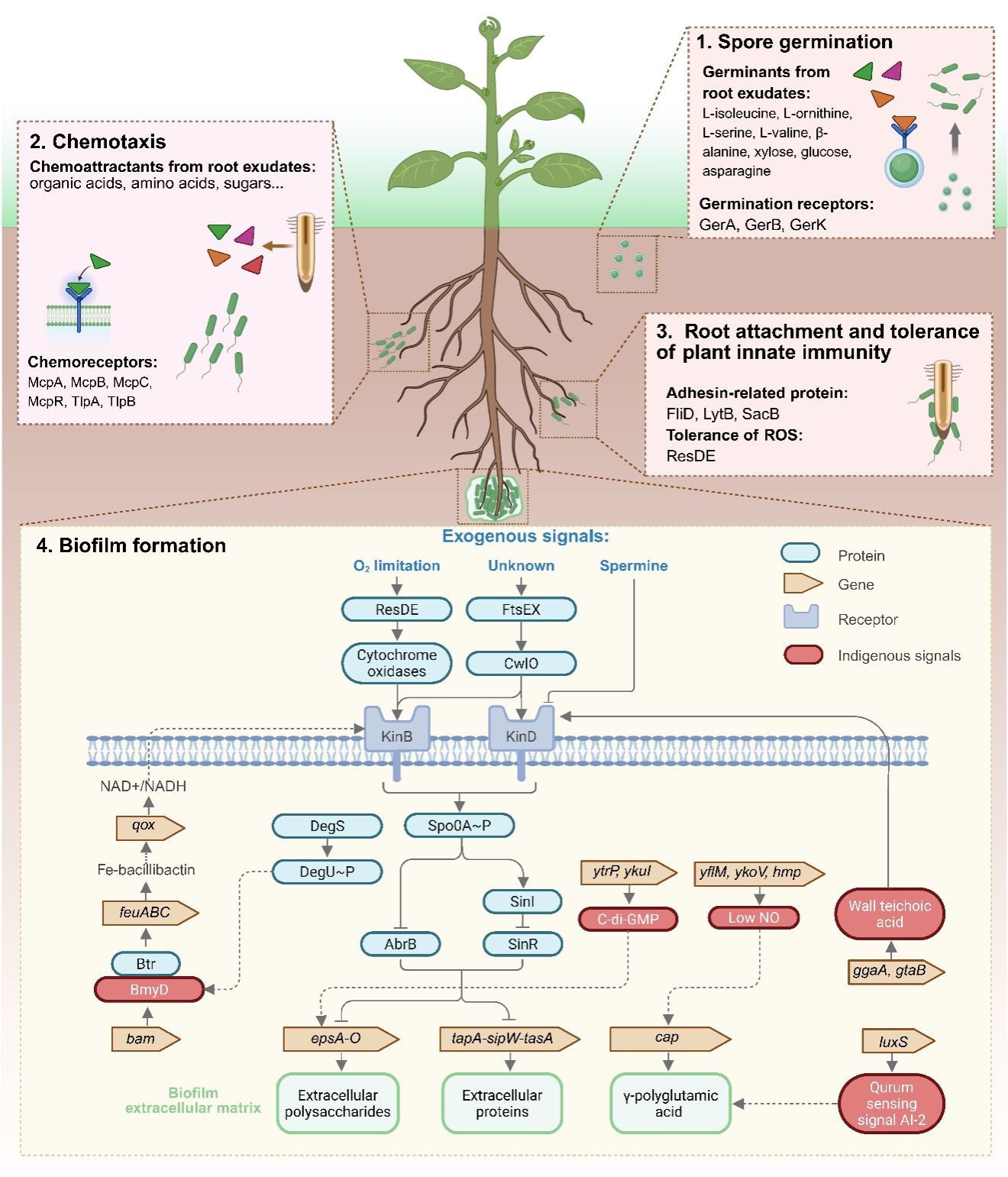 三、根系定殖机制。有效的根系定殖是植物促生菌发挥功能的前提。菌株SQR9在根际经历芽孢萌发、趋化、黏附和生物被膜形成等阶段。芽孢可长期存活,遇到根系分泌物迅速萌发并趋化至根;菌体借助黏附蛋白附着根表,并能够耐受植物免疫反应;随后在根表形成由多糖、γ-聚谷氨酸和胞外蛋白组成的生物被膜(Biofilm),通过信号系统协调群体行为,实现稳定定殖。生物被膜阶段是根际定殖的核心,也是研究最深入的环节。