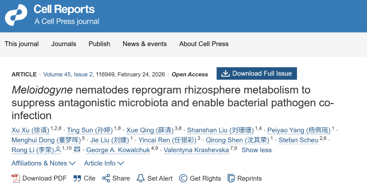 沈其荣院士团队李荣课题组在土壤病原线虫重编程根际代谢抑制拮抗微生物群落并促进细菌病菌入侵机制研究方面取得重要进展,成果以《Meloidogyne nematodes reprogram rhizosphere metabolism to suppress antagonistic microbiota and enable bacterial pathogen co-infection》为题发表于国际学术期刊《Cell Reports》。该研究系统解析了根结线虫对植物代谢过程及根际微生物群落结构的调控机制,揭示了线虫通过重塑植物—微生物互作关系,促进病原生物协同侵染植物的新模式。