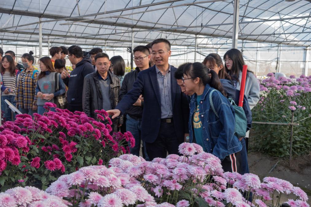 抵达湖熟基地,陈发棣带领同学们走进菊花温室,向同学们逐一介绍丰富的形态各异的菊花品种:“南农极点”“南农紫乒乓”“南农白蝴蝶”……这些由南农培育出的菊花品种深深吸引住同学们的眼球。随后,他又介绍说,学校许多菊花品种都得到了大范围的推广应用,尤其是在带动地区菊花食品加工、观光旅游、产业扶贫等方面发挥了重要作用,为地方经济社会发展作出了重要贡献。我校菊花等产业助力麻江扶贫工作也入选部属高校精准扶贫精准脱贫十大典型项目。班上的留学生思塔希感慨到:“陈老师介绍的这些菊花真的惊(艳)到我了,我也想把南农美丽的菊花带到我的家乡。”
